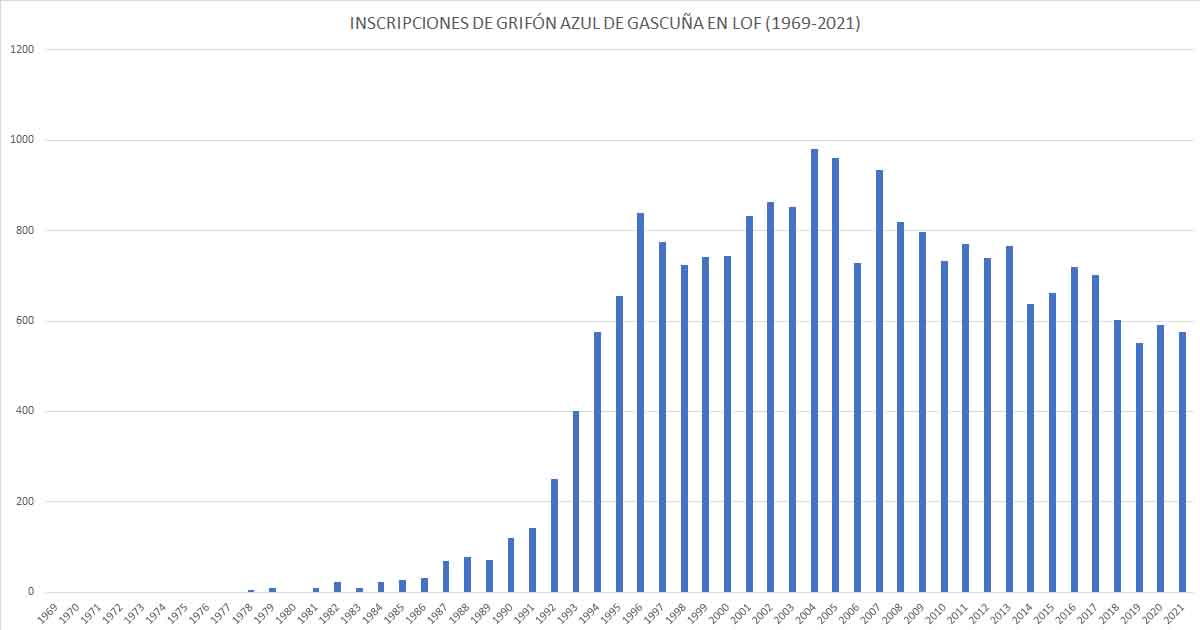 Descendientes de los perros acogidos por este estándar son los que llegaron hasta los primeros registros oficiales en el libro de registro de la Sociedad Central Canina, si bien el número de ejemplares era muy escaso. De esta forma en los registros de la Sociedad Central Canina de Francia, antes de 1977 tan solo existian 10 ejemplares registrados con dicha denominació. En 1978 se inscribieron tan solo 4 ejemplares de la raza Grifón Azul de Gascuña, y no es hasta 1984 cuando la raza comienza a despegar en número de inscripciones en Francia, país de origen del Grifón Azul de Gascuña, cuando se registran 23 ejemplares, pero an solo 10 años después ya se inscribieron 401 ejemplares, llegando a un máximo de 981 ejemplares inscritos en el año 2004.